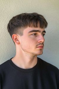 Ce volume supérieur, entre 3 et 7 centimètres en général, est coiffé vers l’avant avec une certaine assise, facilitée par des produits coiffants légers ou fixants à tenue modulable. Il s’agit d’une mise en forme révélatrice de la frange dynamique, posée tel un bec ou une visière, reproduisant l’allure d’une casquette sur le cuir chevelu.